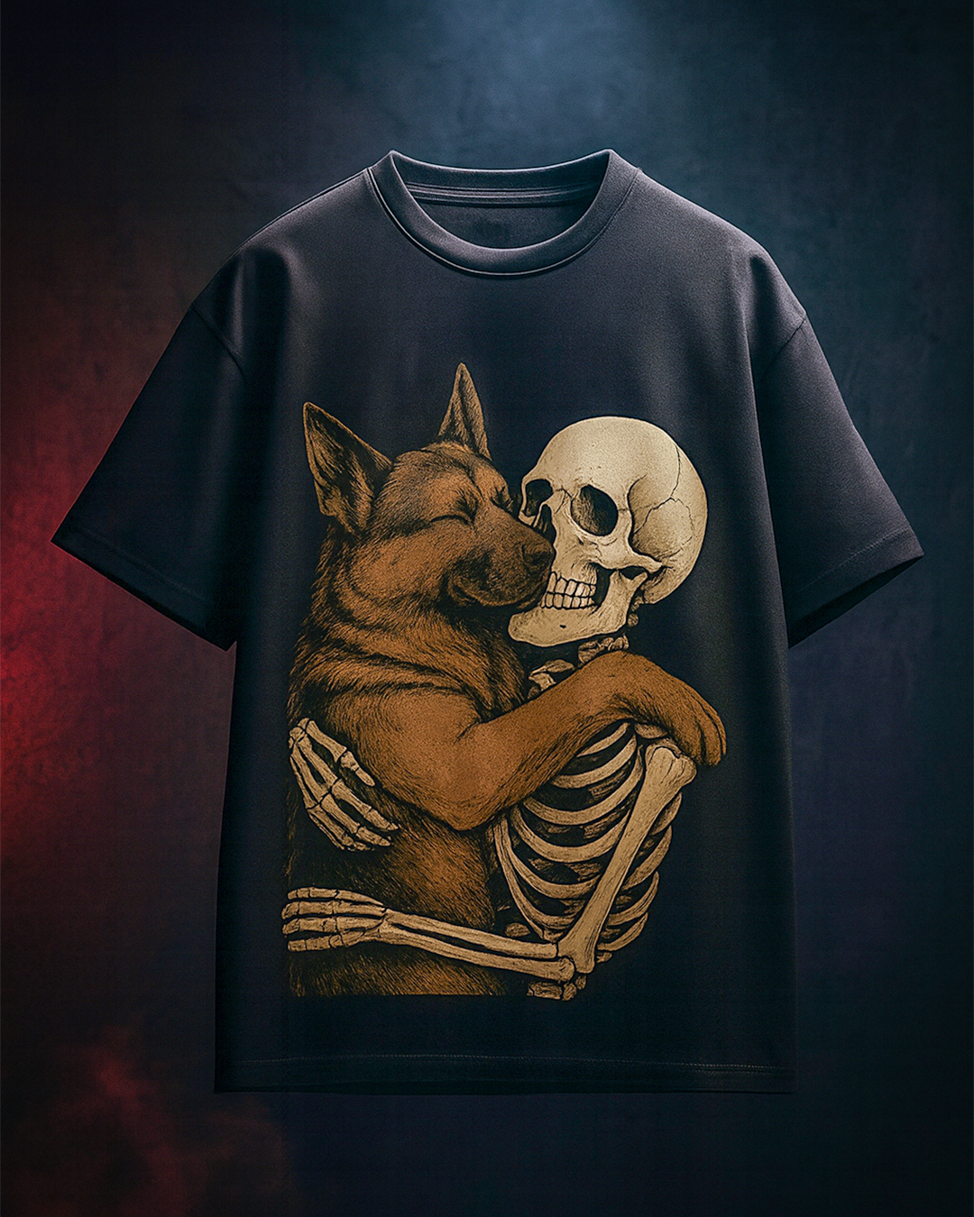 The “Eternal Bond” Oversized Tee from Bold1 tells a story of timeless connection — a loyal dog embracing a human skeleton, symbolizing love that goes beyond life and death. Designed for those who dare to express emotion through art and style, this tee blends streetwear attitude with deep storytelling.
